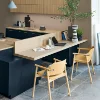 Ein stimmiges Gesamtkonzept: Auch das Umfeld – wie hier die Thekenplatte in Natureiche edelmatt – kann durchgängig gestaltet werden. So entsteht ein harmonischer Übergang zwischen Arbeitsbereich und Wohnraum.