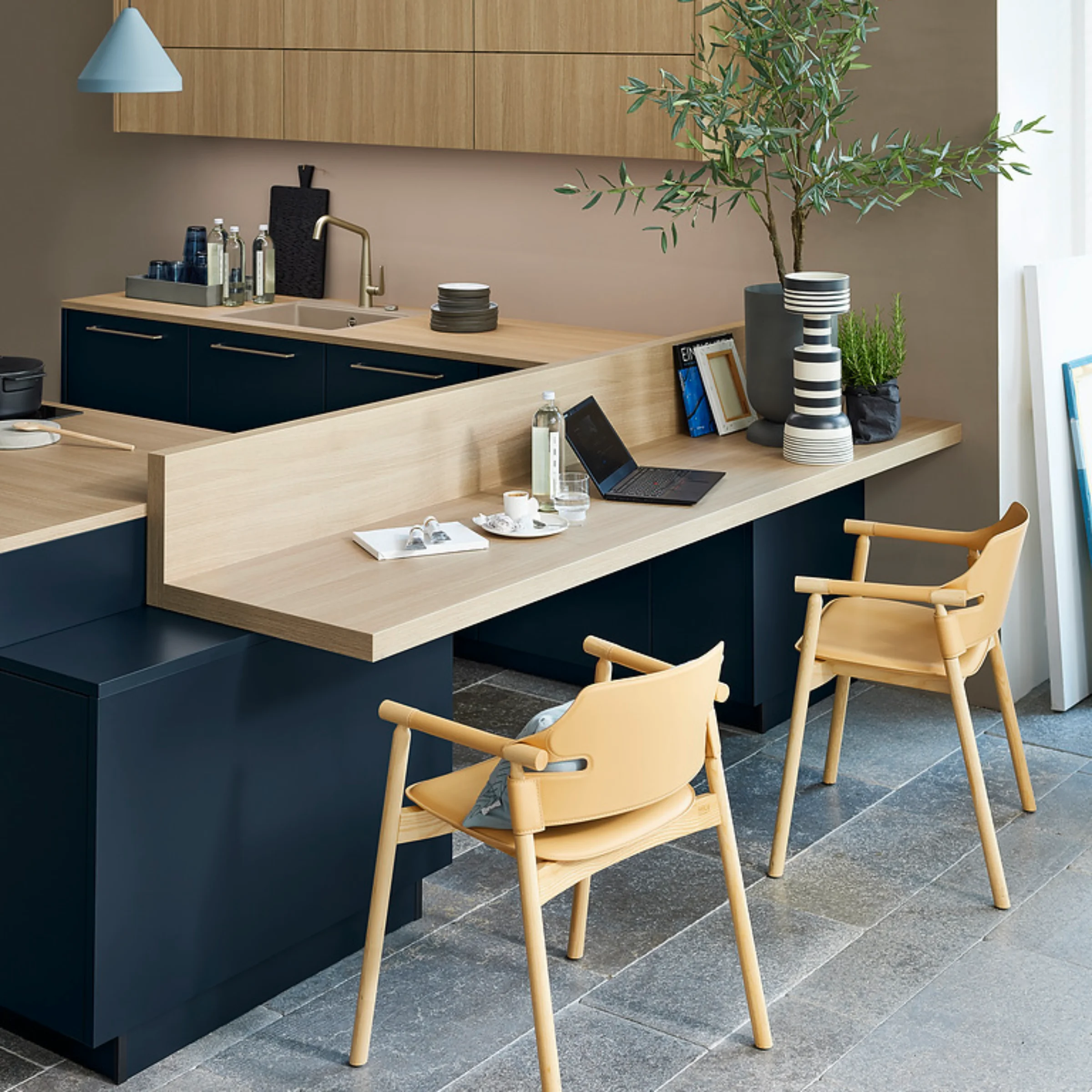 In Kombination mit SOFT LACK in Tiefblau softmatt entsteht ein spannender Kontrast, der Eleganz und Wohnlichkeit vereint. Die durchdachte Planung in U-Form sorgt für kurze Wege und eine optimale Nutzung des Raums – ideal für effizientes Arbeiten und gemeinsames Kochen.