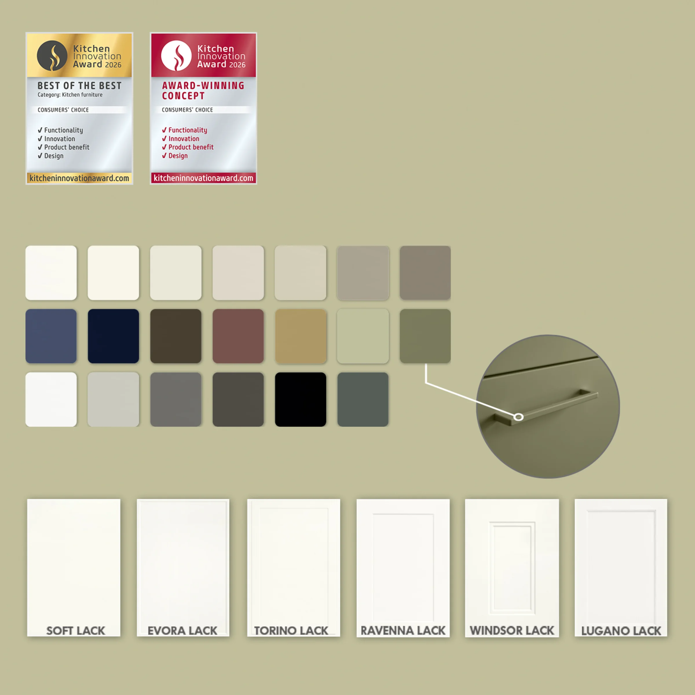 20 Mattlackfarben, 6 Frontformen, ein Griff, der in denselben Nuancen erhältlich ist sowie die exakt passende Wandfarbe – das Mattlack-Konzept von Nolte Küchen schafft Harmonie, die man sehen und spüren kann. Dieses außergewöhnliche Konzept wurde mit dem renommierten Kitchen Innovation Award 2026 ausgezeichnet, der für besonders innovationsstarke Projekte vergeben wird.