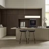 EVORA LACK redefines modern kitchen planning in a delicate way - because the 10 mm frame frames the front with elegance and lightness. It offers maximum flexibility in design - whether classic with handle, with handle track or in the push-to-open version. In a purist design with an island and side cabinets in a subtle greige color, the seating niche in LEAF Noce Marone with its authentic wood decor creates a warm, homely accent.