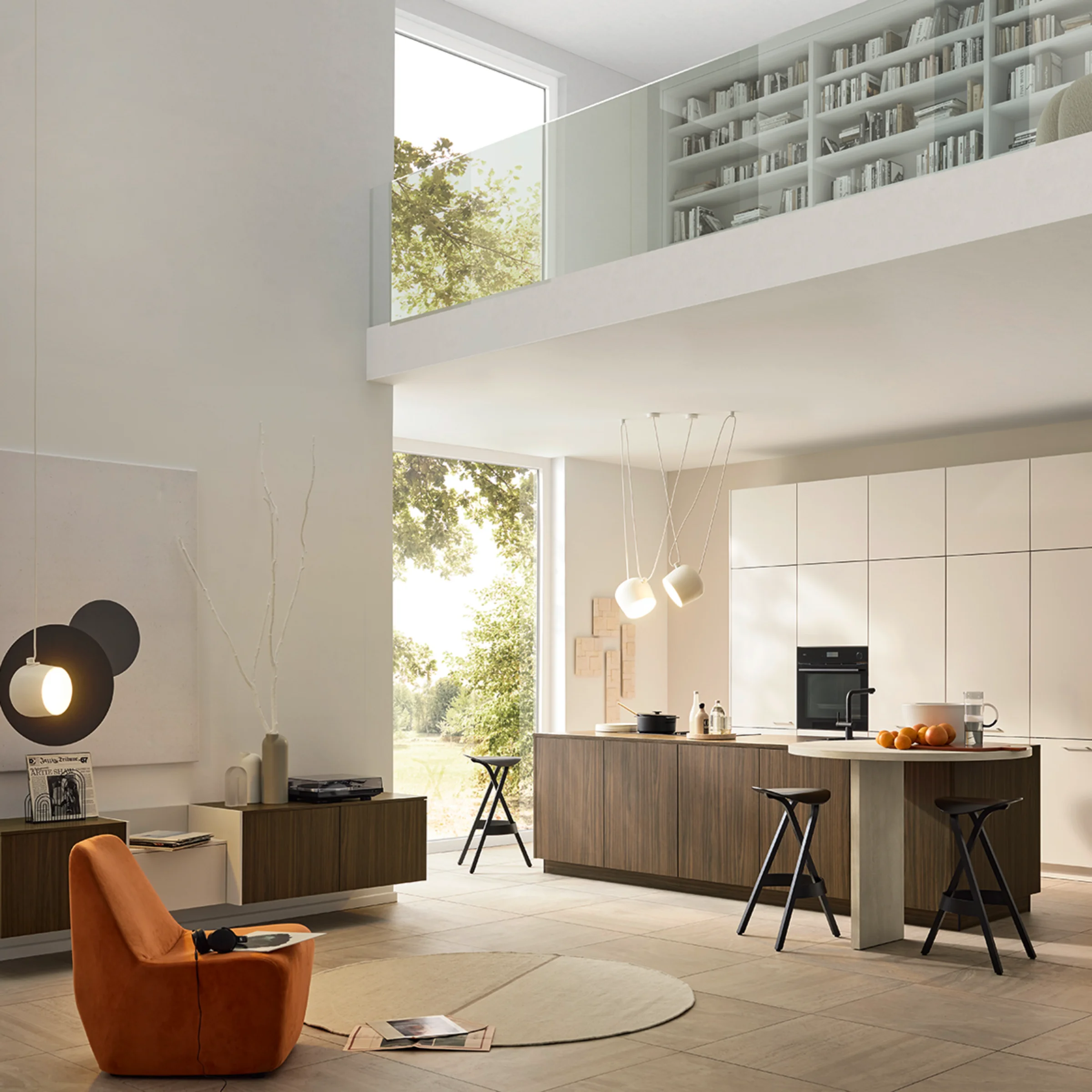 In this kitchen, neoFLAT in Rosado walnut brings a warm accent to the room, which is broken up by side cabinet elements in SOFT LACK Greige soft matt. The linear look is enhanced by the handleless design of the cooking island in MatrixArt ONE. The living area picks up on the material and color combination of the kitchen, creating a harmonious overall look.