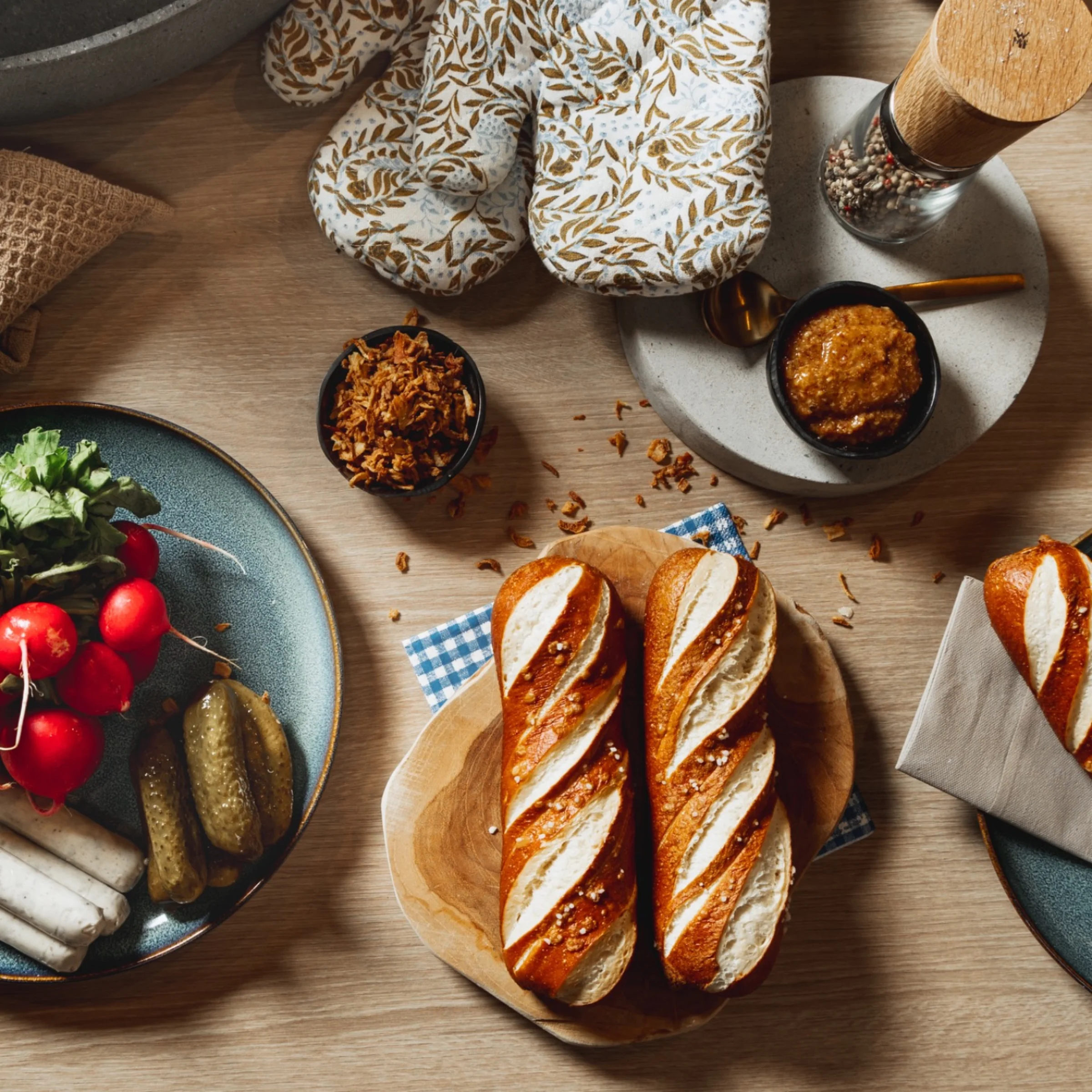 Instead of classic bratwurst, here is a hot dog recipe that combines street food and Bavarian cuisine ingeniously: Crunchy sausage in a fluffy pretzel bun, garnished with fresh radishes, spicy gherkin, crispy fried onions and creamy mustard dip. Perfect if you want to make a hot dog yourself that will surprise your guests - whether for an Oktoberfest party or as a special party idea in between.