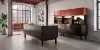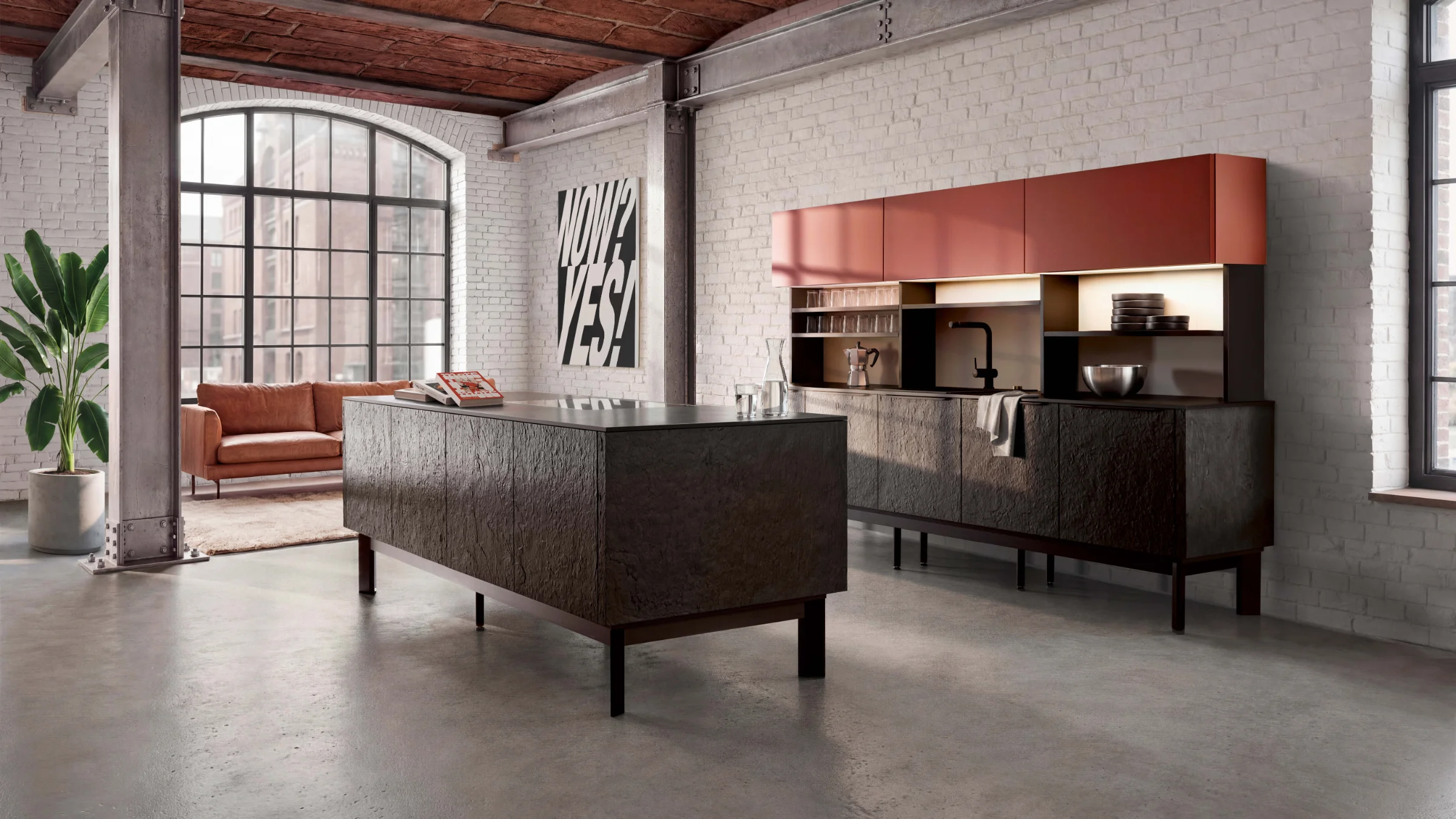 In a loft-style space featuring raw materials and expansive windows, a kitchen is taking shape that plays with contrasts: jet-black slate lends a powerful, matte depth, while tinted mirrored cabinet fronts visually expand the space. The central island serves as a calm, solid anchor in the room — minimalist, precise, and expressive.