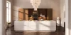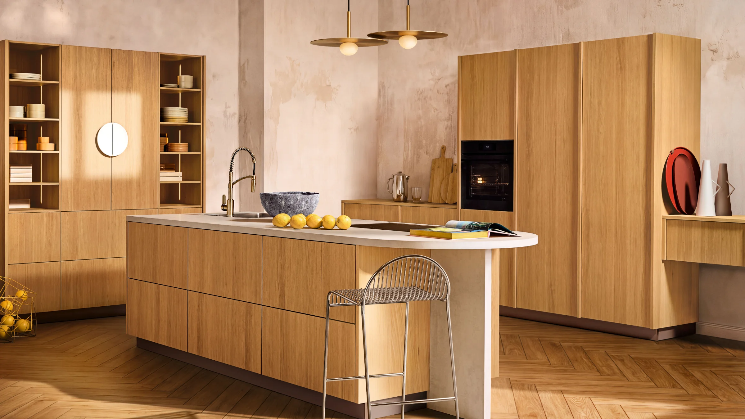 In a spacious room with classic architecture, a kitchen is taking shape that brings people together: neoFLAT Walnut Rosado adds depth and warmth to the room’s central axis, while SOFT LACK Cashmere in a soft matte finish brightens and opens up the surfaces. The central island becomes the focal point—functional, inviting, and visually striking all at once.