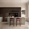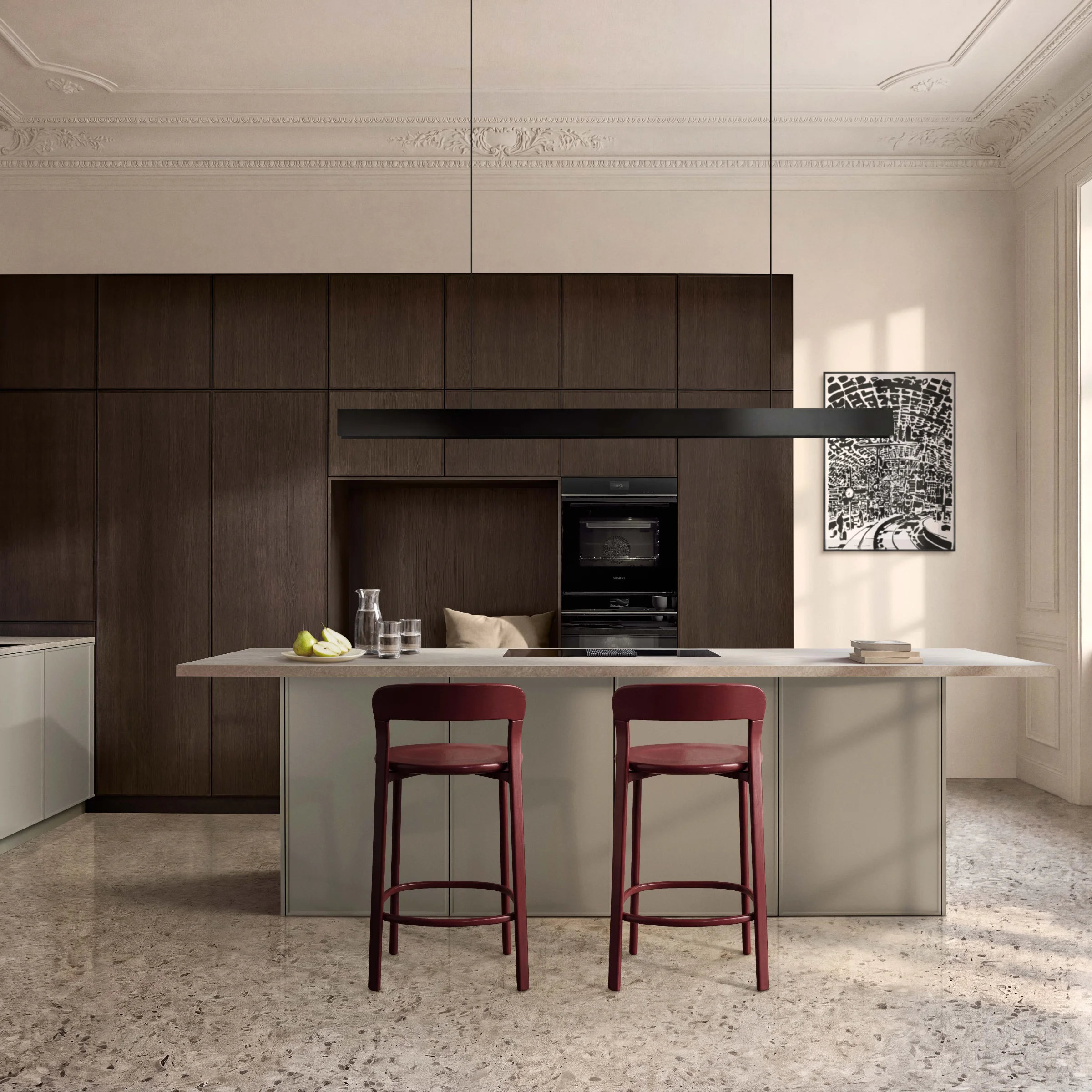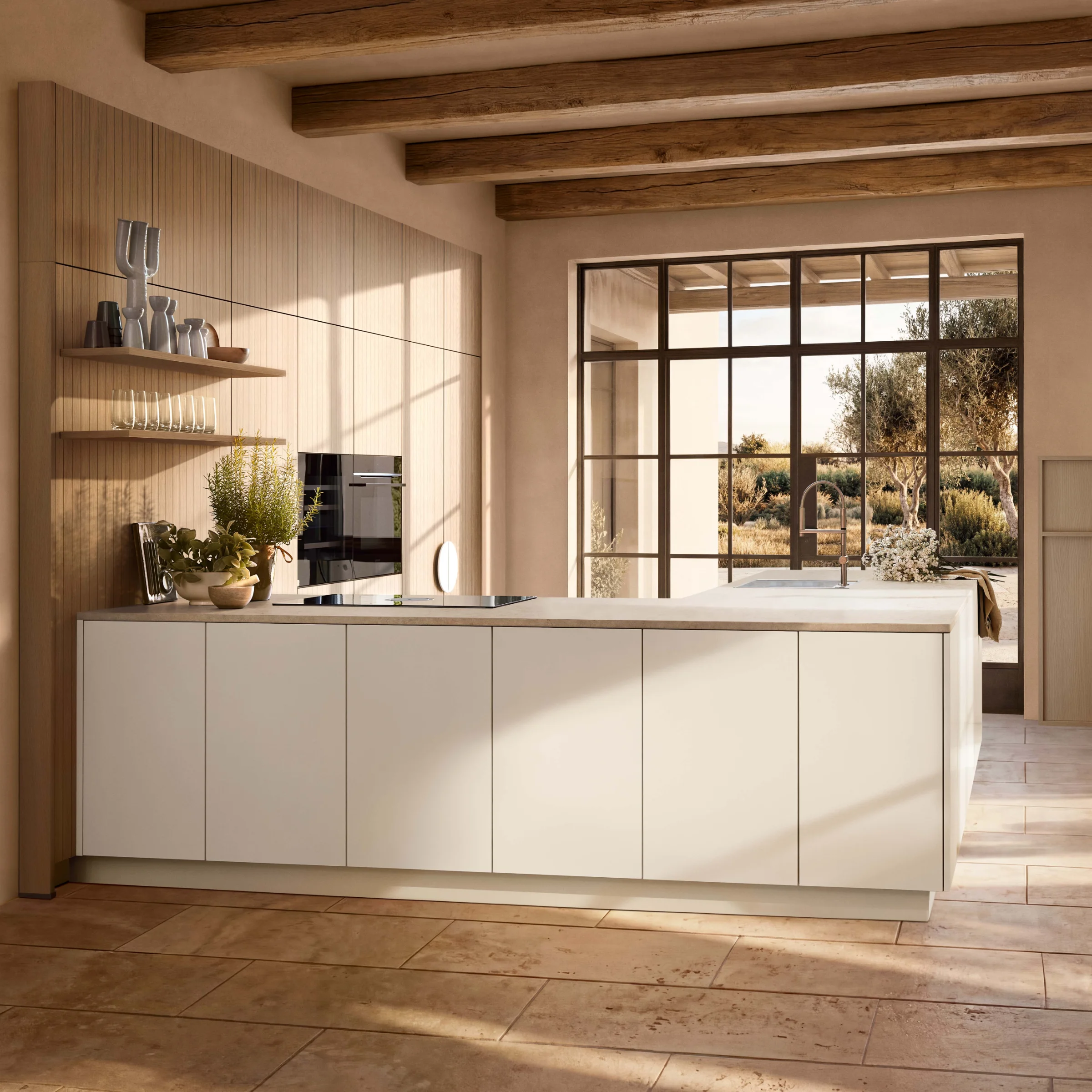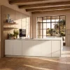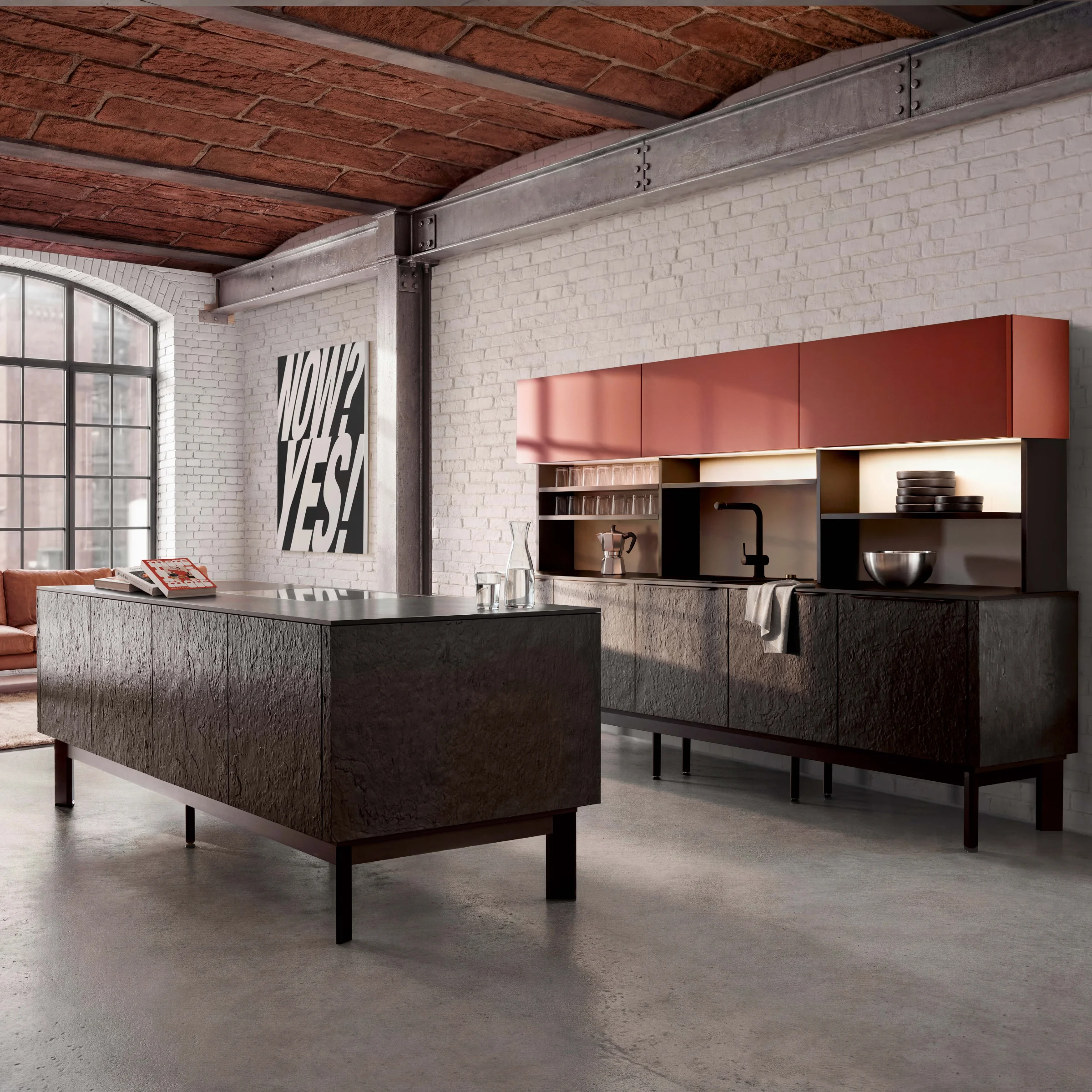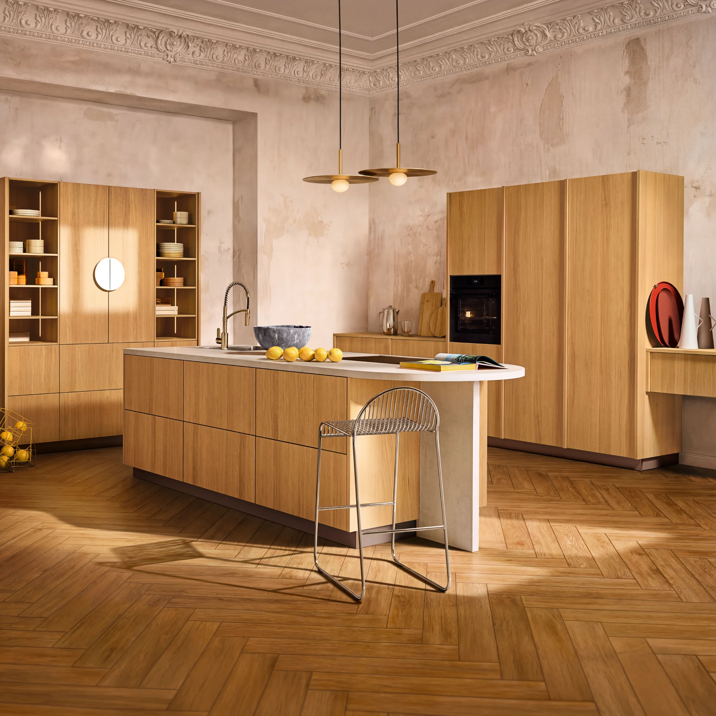 The kitchen front neoLODGE brings with its vertically grooved real wood veneer a special design aesthetic in wood look into the room – inspired by Italian living culture. Whether in blackened oak or diamond oak, this front creates a homely atmosphere with an architectural appeal through structure and depth. In combination with elegant display cabinets, the handleless system MatrixArt or the illuminated recessed handles, a harmonious overall picture emerges for design-conscious people with demands.