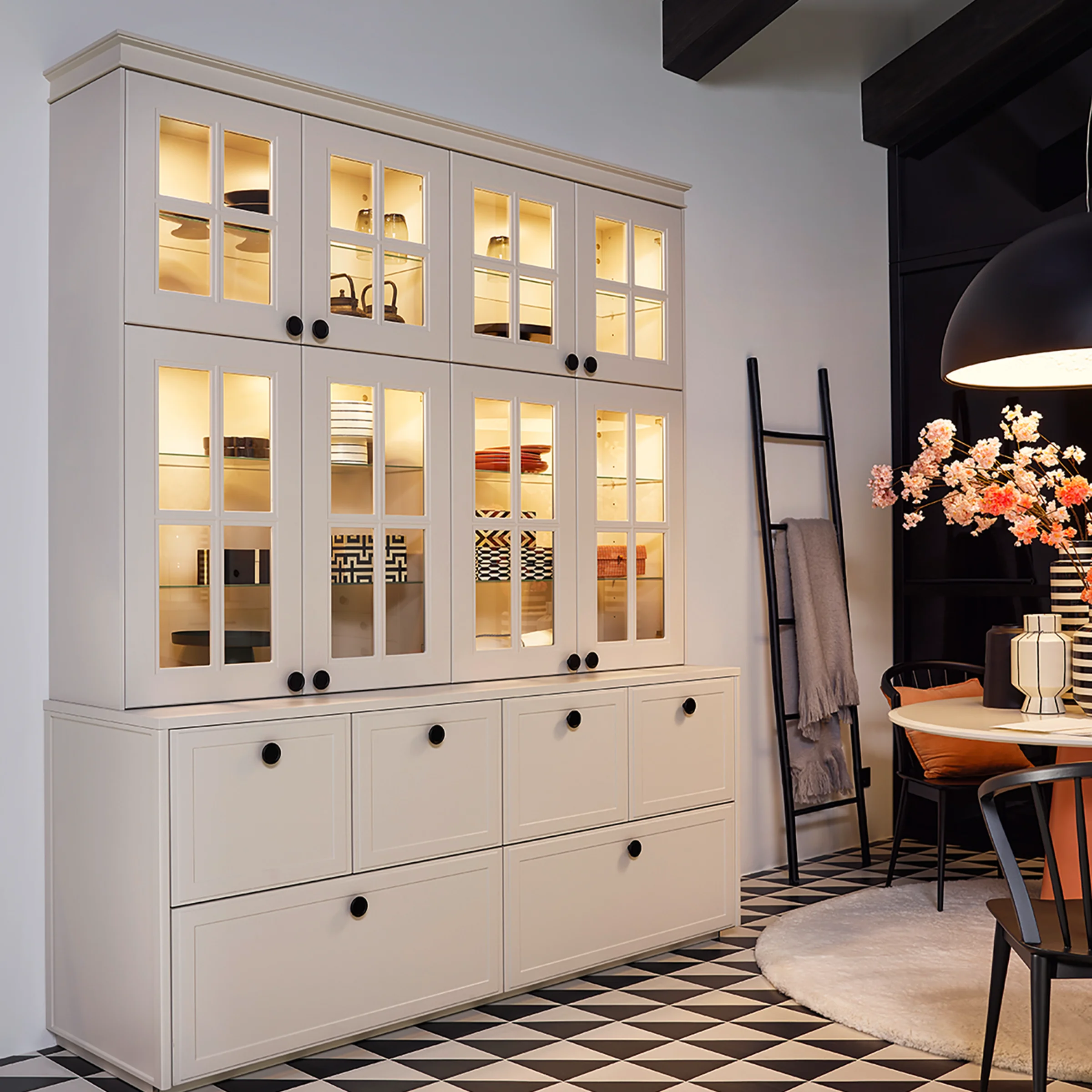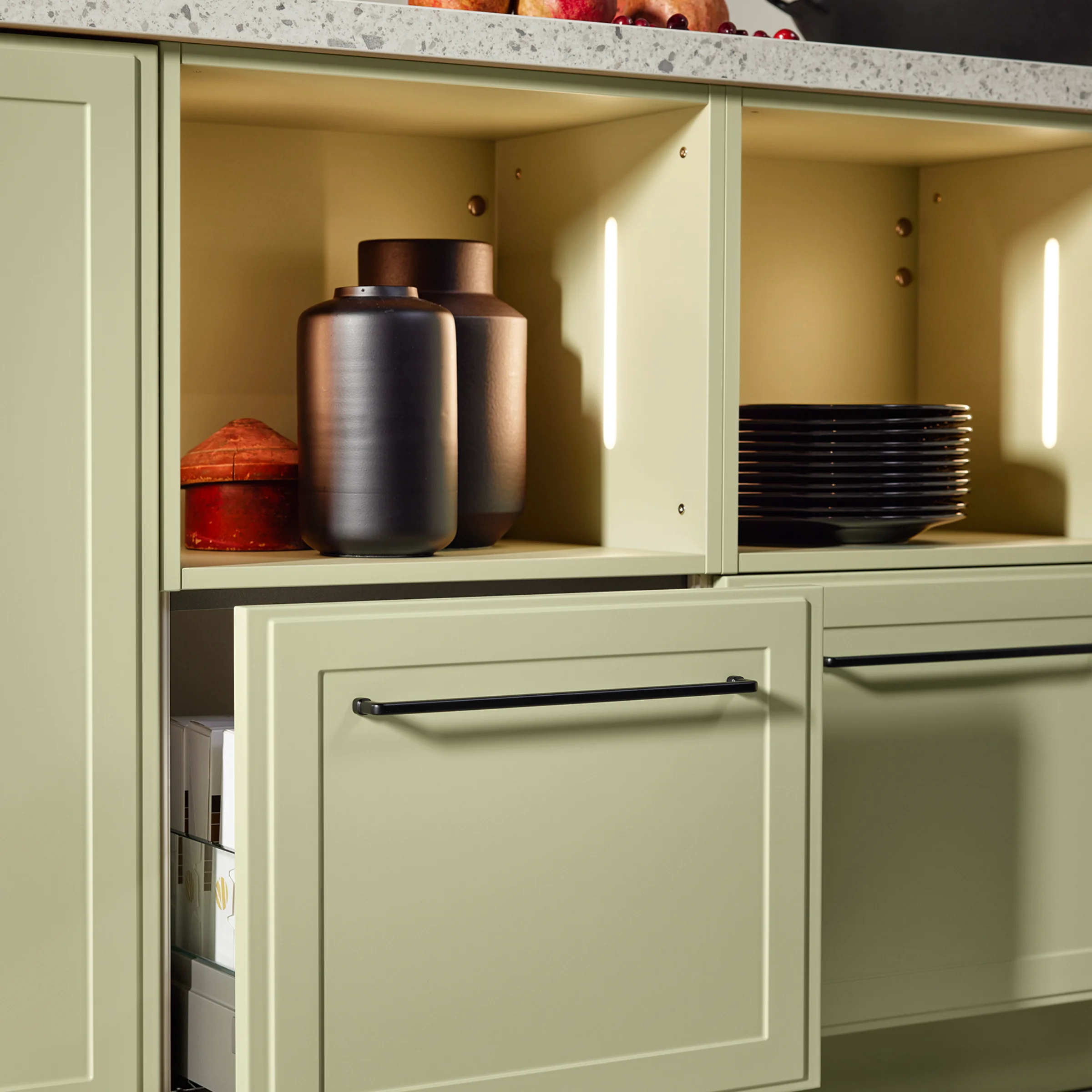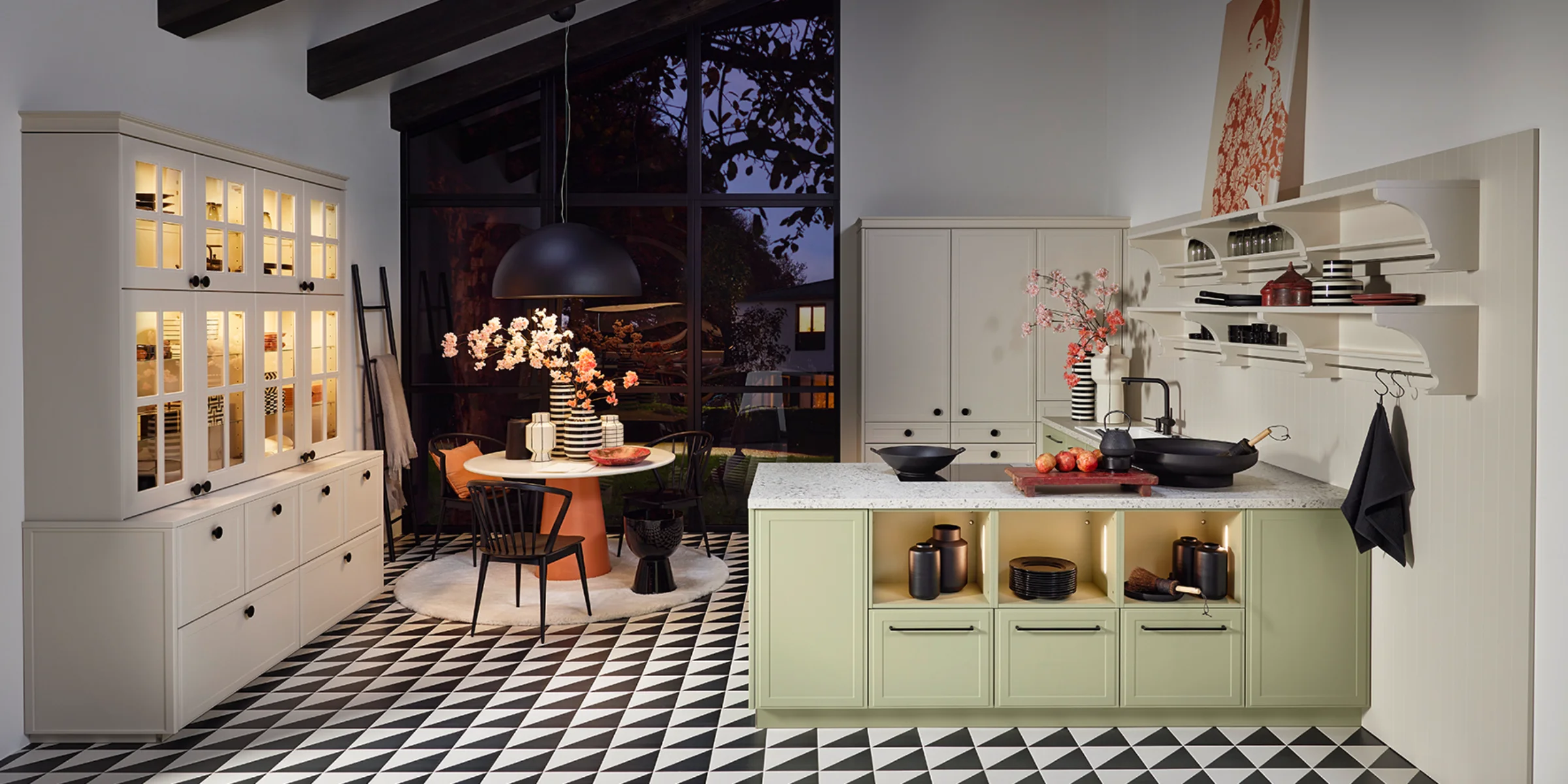 Caratteristiche tipiche dello stile rustico, quali frontali con cornice, scaffali a vista ed elementi progettati con cura, creano un’atmosfera accogliente e sottolineano il carattere affascinante di questa cucina. La linea di mobili in Avocado softmatt apporta un tocco fresco e naturale all’ambiente, mentre i mobili per elettrodomestici in Kaschmir softmatt completano con eleganza l’insieme.