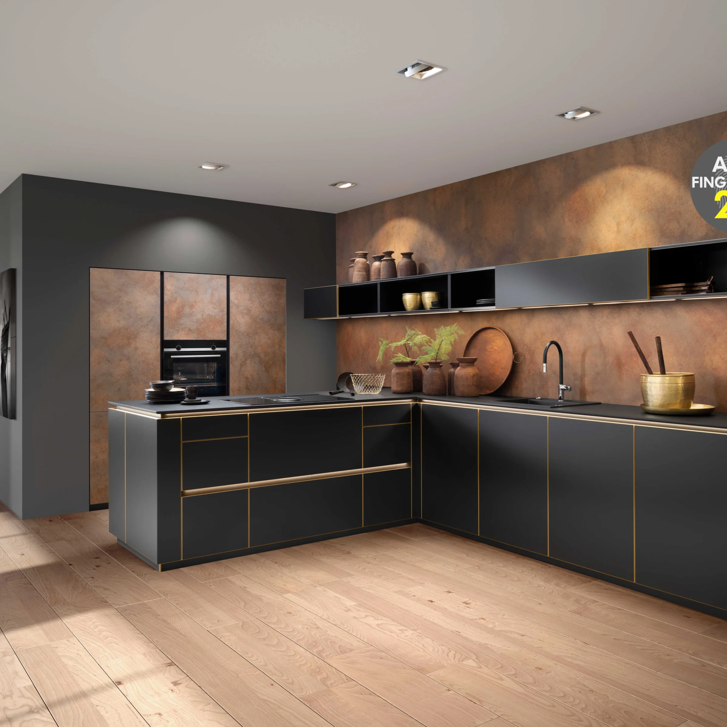 Il frontale FLAIR combina un design purista e moderno con accenti raffinati. La sua superficie laminata opaca è particolarmente resistente alle impronte grazie alla tecnologia Anti-Fingerprint 2.0 e rimane sempre curata anche nell'uso quotidiano. I bordi perimetrali in ottone conferiscono un tocco elegante e di alta qualità e donano al frontale il suo aspetto caratteristico.
