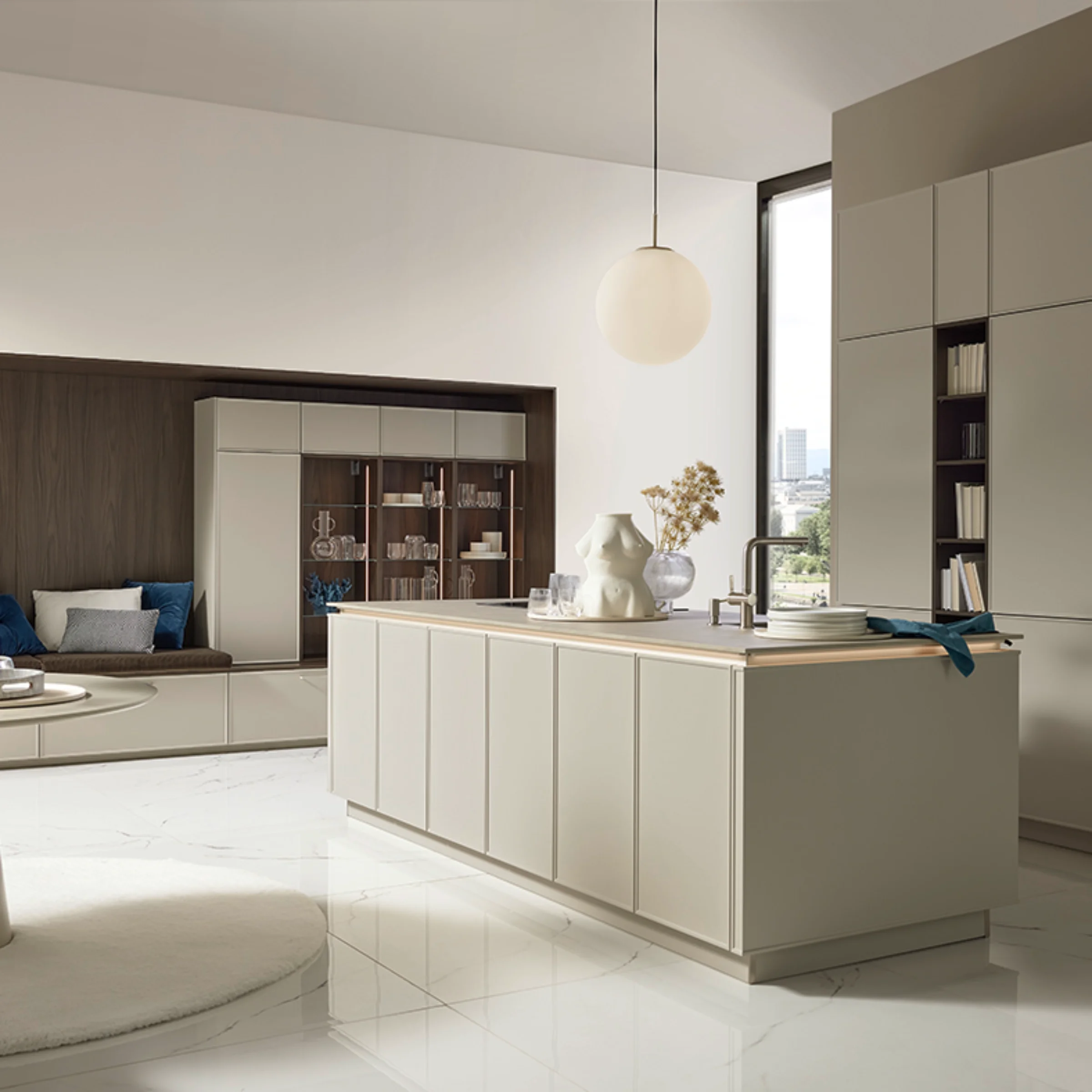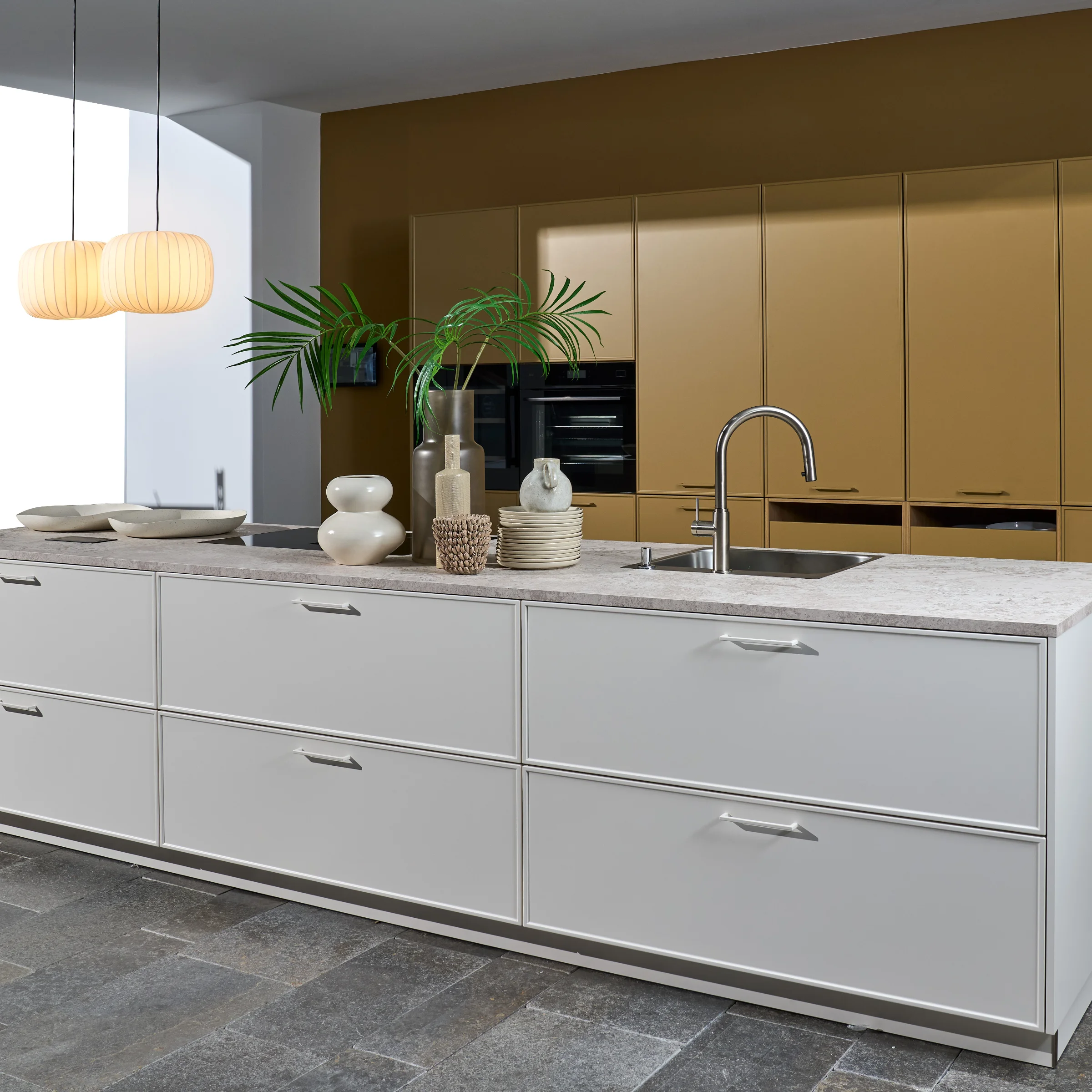 Dit design geeft de voorkeur aan een helder, natuurlijk effect. De nieuwe matte lakkleur Greige komt samen met het eveneens nieuwe EVORA LACK front, dat met zijn fijne frame-optiek moderne elegantie in de keuken brengt.