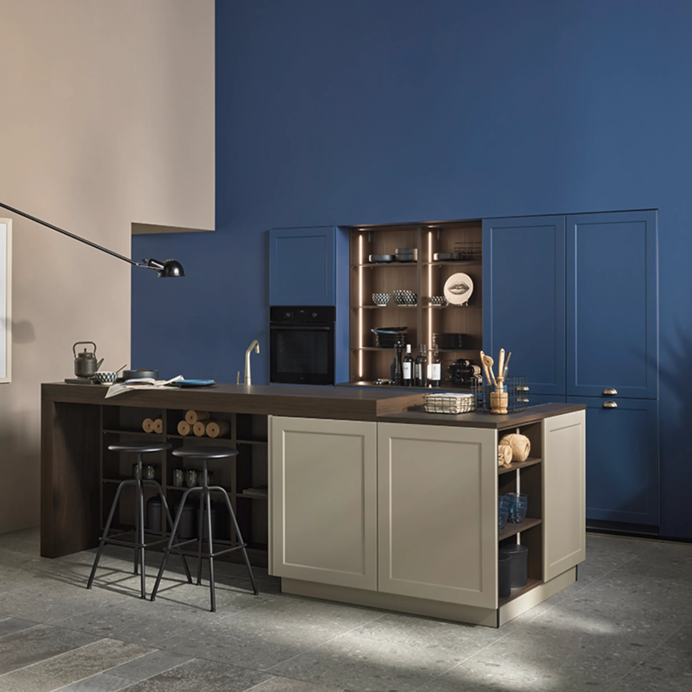 Fijne kaderprofielen geven de fronten een handgemaakt karakter en het Noce Marone werkblad benadrukt met zijn houtlook de warme, natuurlijke uitstraling van de keuken. Het concept wordt aangevuld door handgrepen in mangaanbrons, die het kleurcontrast elegant afronden. Het resultaat is een moderne landhuislook die klassieke elementen combineert met een gedurfd kleurenschema.