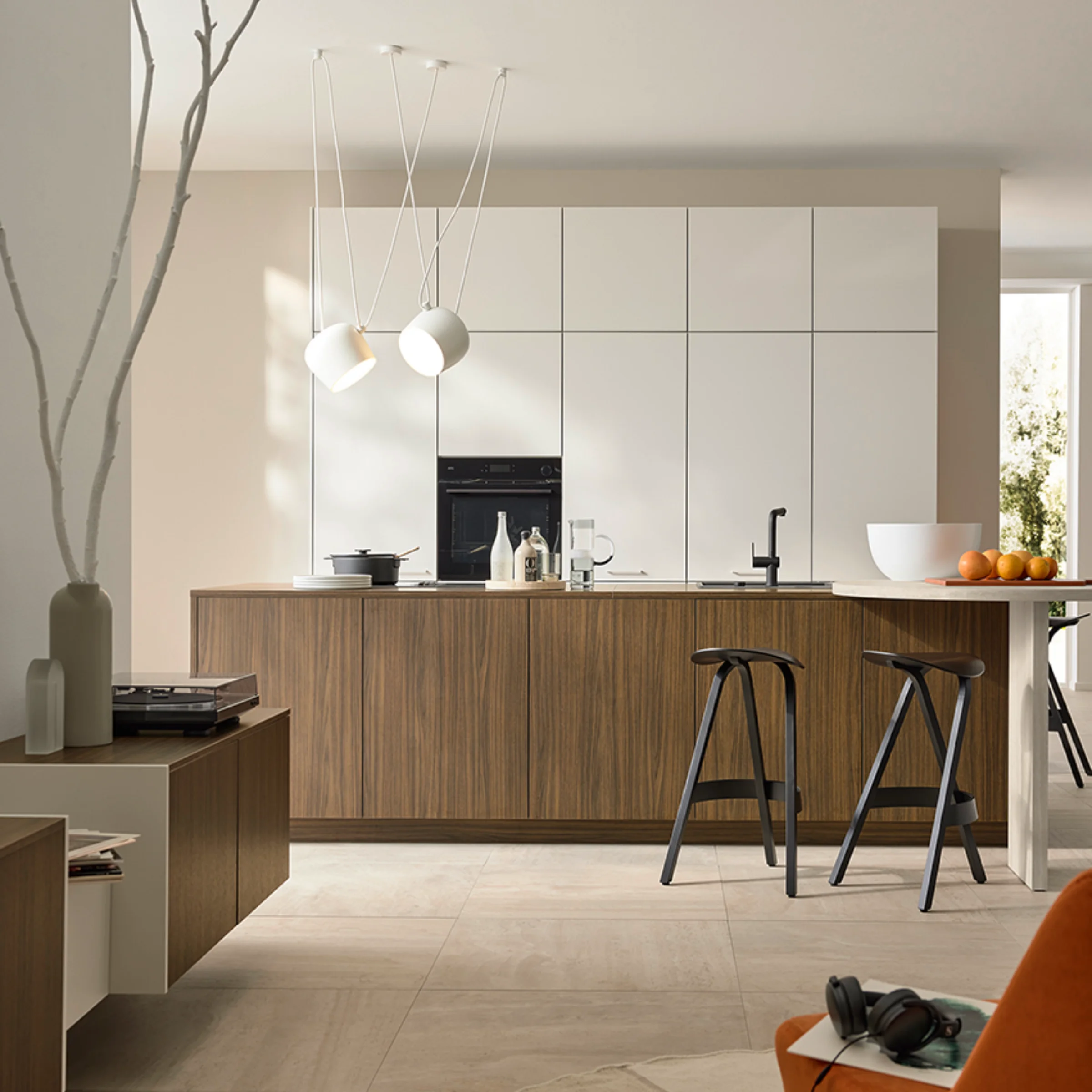 In dit ontwerp ontmoet SOFT LACK cashmere het warme houtdecor MANHATTAN Havana walnut. De nieuwe matte laktint geeft de keuken een rustige, natuurlijke uitstraling en harmonieert perfect met de nerven van het hout.