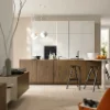 W połączeniu z jasnymi drewnianymi elementami powstaje harmonijne połączenie struktury i spokoju. Matowy lakier sprawia, że powierzchnia jest miękka w dotyku, a Greige, kolor pomiędzy szarością a beżem, tworzy ciepłą, domową atmosferę - idealną do nowoczesnych kuchni o naturalnym charakterze.