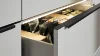 Fascynująca gra linii ARTLINE Stripe Wood Crema tworzy dynamikę: ekstra głębokie szafki wysokie wystają z ciągu szafek dolnych aż po sufit, podczas gdy otwarte półki rozluźniają widok frontów w części jadalnej.